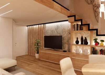La distribuzione degli spazi è studiata per favorire continuità e fluidità tra zona giorno e zona notte. Il living diventa il cuore della casa, un ambiente raccolto ma aperto, pensato per la condivisione e il riposo.
