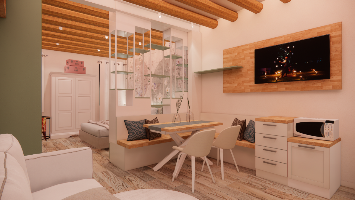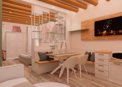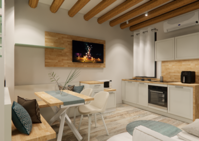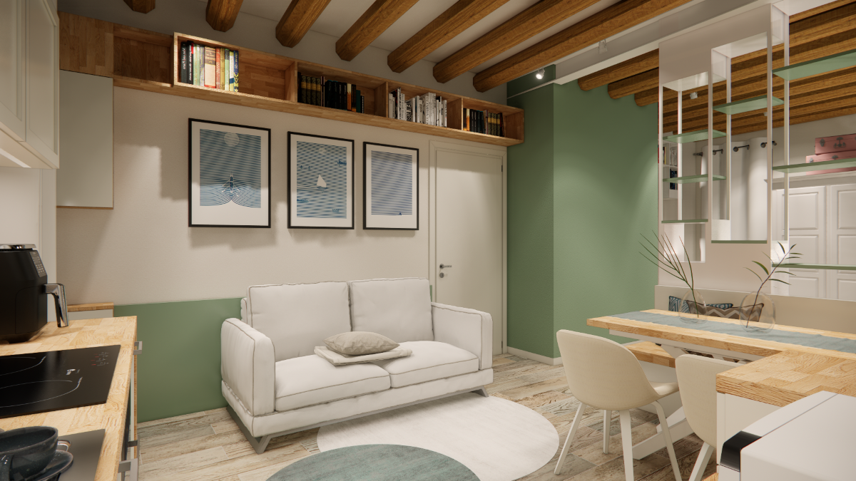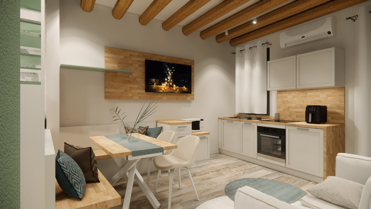 Un progetto di interior design per un appartamento a vocazione turistica, dove distribuzione intelligente, arredi su misura e comfort quotidiano trasformano uno spazio compatto in una casa accogliente e versatile.