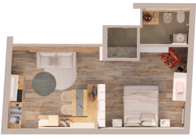 Il divano letto consente di aumentare la ricettività senza compromettere il comfort, mentre soluzioni contenitive integrate aiutano a mantenere ordine e praticità. Il bagno, compatto ma completo, è studiato per garantire comfort quotidiano anche in spazi contenuti.