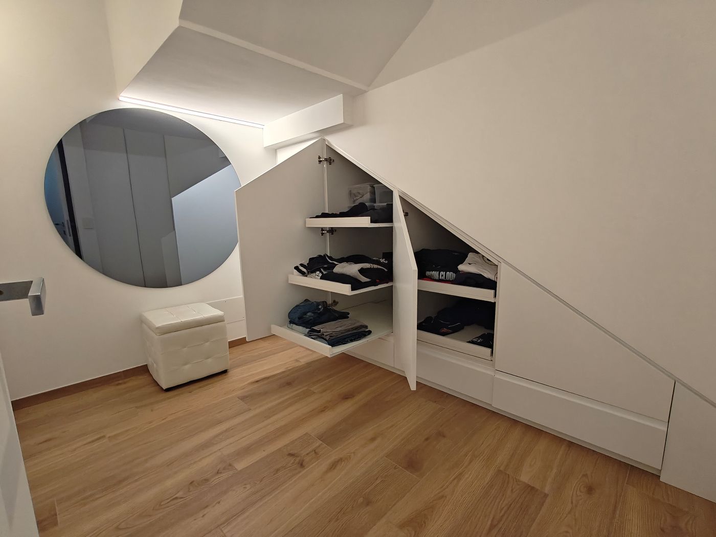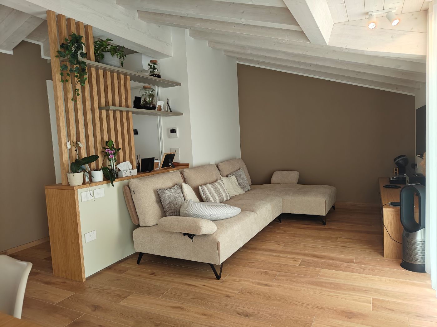 La progettazione degli spazi è orientata al comfort e alla fruibilità quotidiana. Il piano mansardato accoglie il living, con una zona divano raccolta e intima, separata dall’ingresso da un divisorio su misura in laccato e rovere naturale, arricchito da mensole con illuminazione LED integrata.