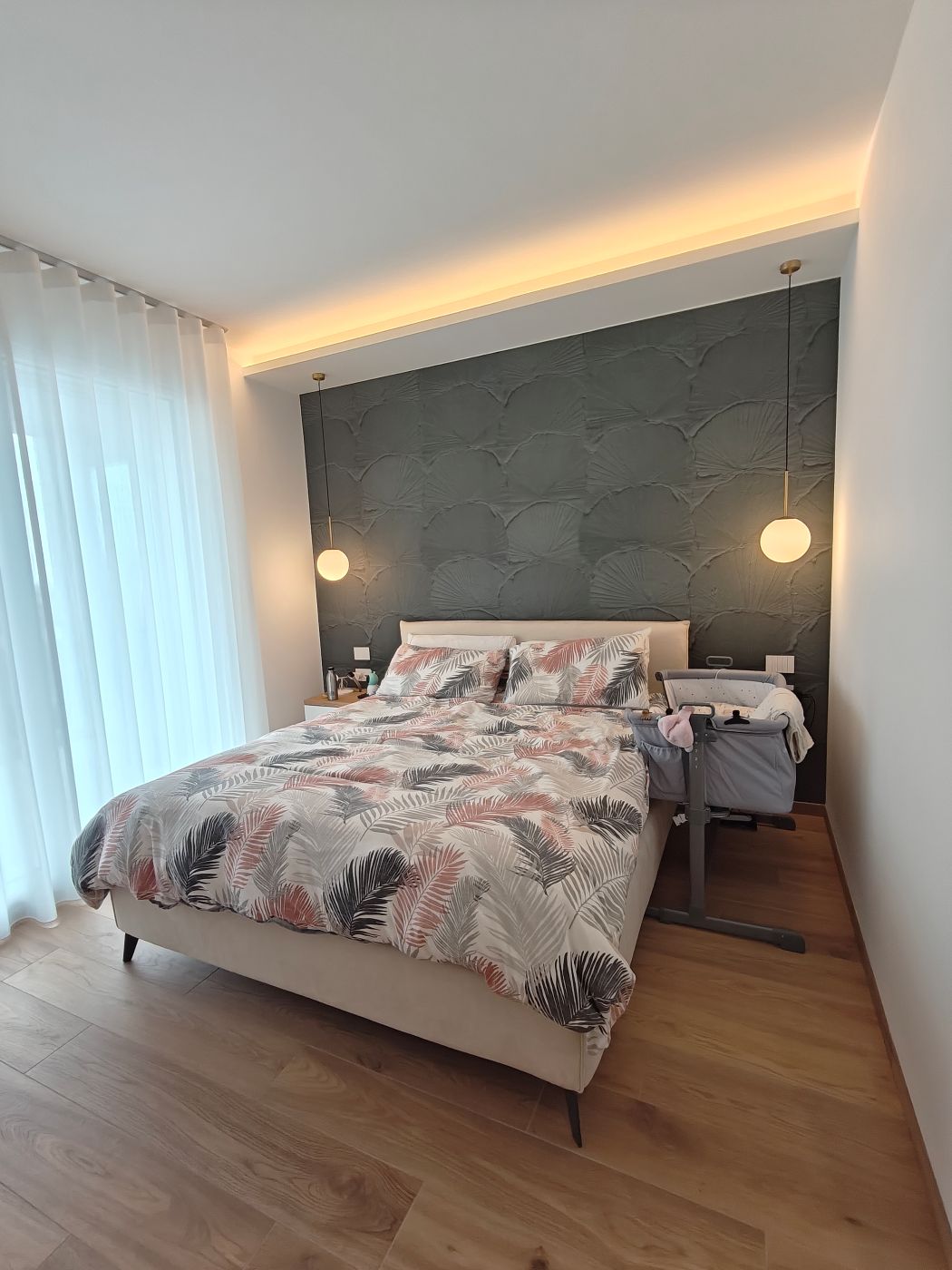 La camera principale è caratterizzata da una carta da parati verde Instabilelab, scelta per dare profondità e identità allo spazio. L’intero progetto è pensato come un sistema coerente, dove ogni ambiente dialoga con l’altro in modo naturale.