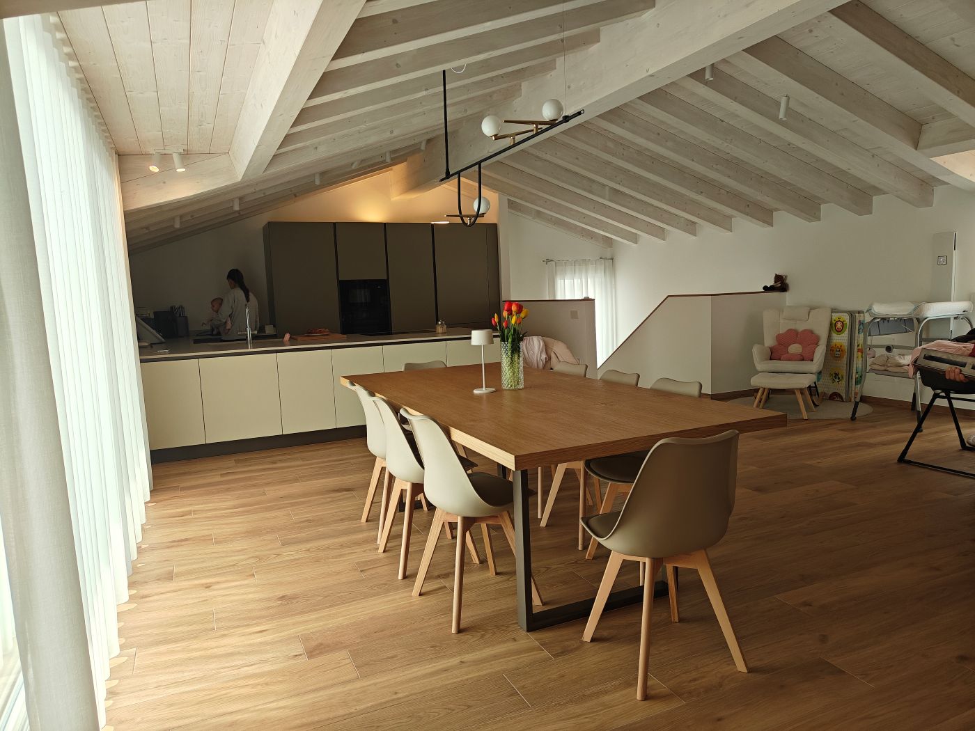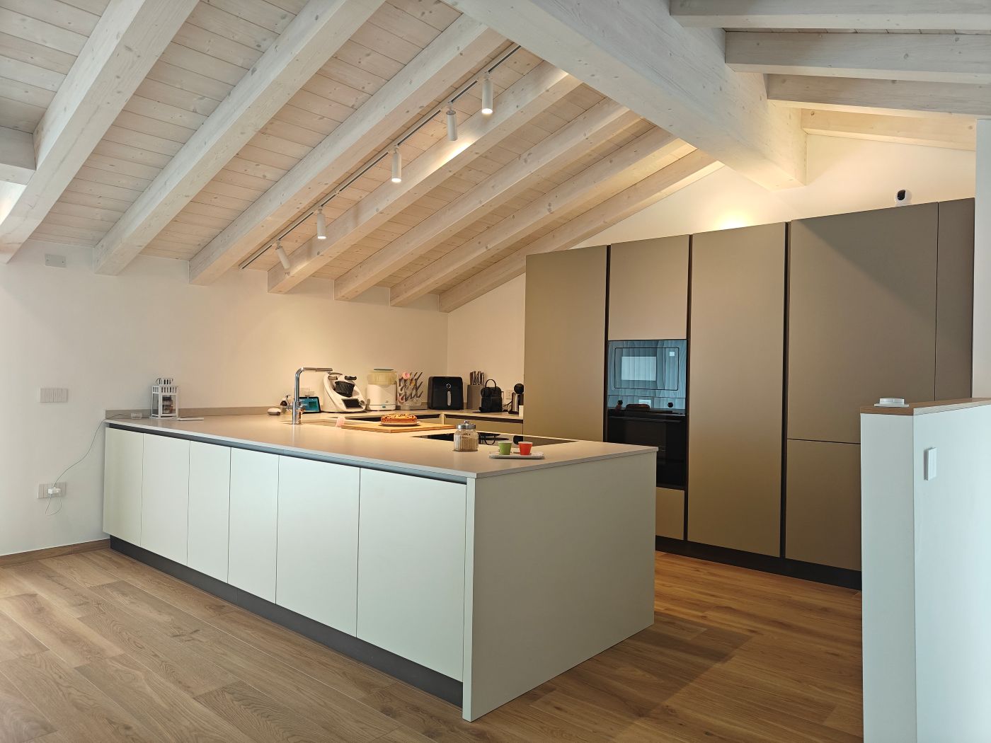 La cucina, collocata nel piano mansardato, è caratterizzata da ante laccate bicolore, top in Okite ed elettrodomestici Smeg, ed è pensata come elemento centrale del living. Il tavolo e le finiture in rovere naturale dialogano con il resto dell’arredo, creando continuità materica in tutta la casa.
