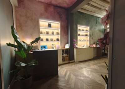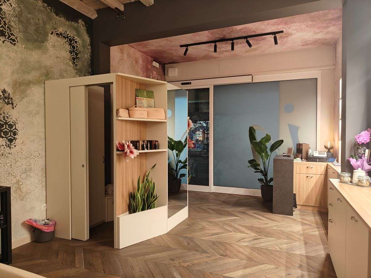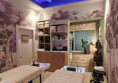 Arredi su misura, legni chiari, finiture delicate e inserti decorativi sono studiati per accompagnare l’esperienza senza mai sovrastarla. Ogni dettaglio è pensato per trasmettere calma, equilibrio e qualità percettiva. Le tonalità della sabbia e del legno naturale si intrecciano con nuance salvia e melanzana, creando un ambiente accogliente, avvolgente e calmante. La carta da parati della sala trattamento riprende le cromie melanzana, mentre la cromoterapia a soffitto contribuisce a costruire un’atmosfera intima e rigenerante.